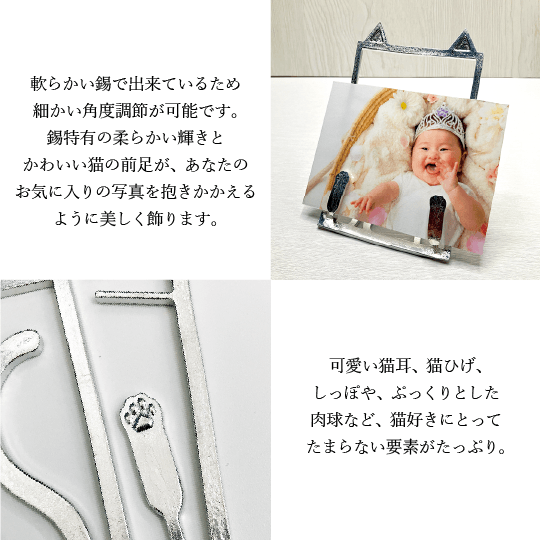 錫特有の柔らかい輝きとかわいい猫の前足が、あなたのお気に入りの写真を抱きかかえるように美しく飾ります。